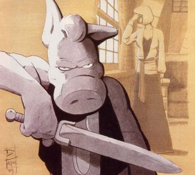 Above – Cerebus & Jaka were just told that the news item they read online was a prank. From the cover of Cerebus the Aardvark #75 by Dave Sim and Gerhard