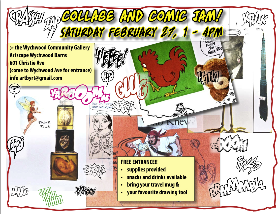 – For a change of pace we’re experimenting with an afternoon jam! Saturday, February 27th, 1-4 p.m. at the Wychwood Community Gallery, 601 Christie Ave. (use the Wychwood Ave. entrance) Wychwood Barns, Community Gallery. A short walk from St. Clair West Subway Station. There’ll be a lot of cutting and pasting.