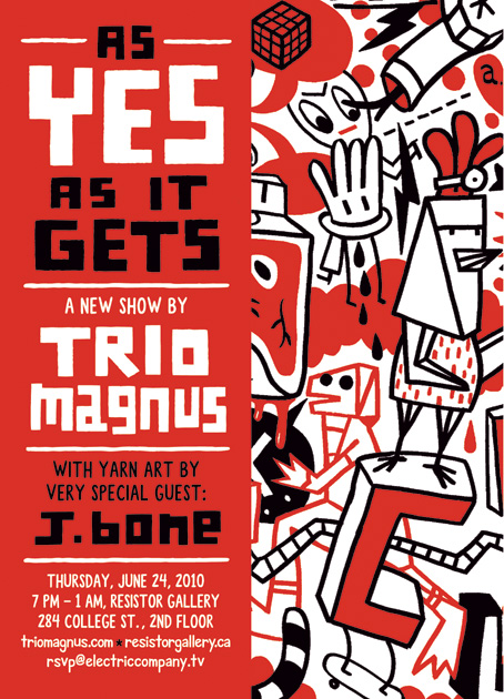 As all Torontonians know, the G20 Summit will turn the city into a miserable tangle of concrete, chain-link and pepper spray. The one bright spot? The opening of As Yes As It Gets, a new, eye-popping show from the Trio Magnus collective (Aaron Leighton, Steve Wilson and Clayton Hanmer) at Resistor Gallery! Armed with only red and black markers and a whole lot of canvas, Trio Magnus has spent since January doing what they do best: drinking Sapporo tall boys, listening to Zeppelin and creating a surreal, spicy masala of subconscious tomfoolery in the form of gigantic six-foot square drawings as well as smaller silkscreen prints. And if that weren’t enough, comic crackerjack J. Bone will be exhibiting his fantastic yarn sculptures based on Trio Magnus characters. Come on out, and say YES to the ultimate anti-establishment event!