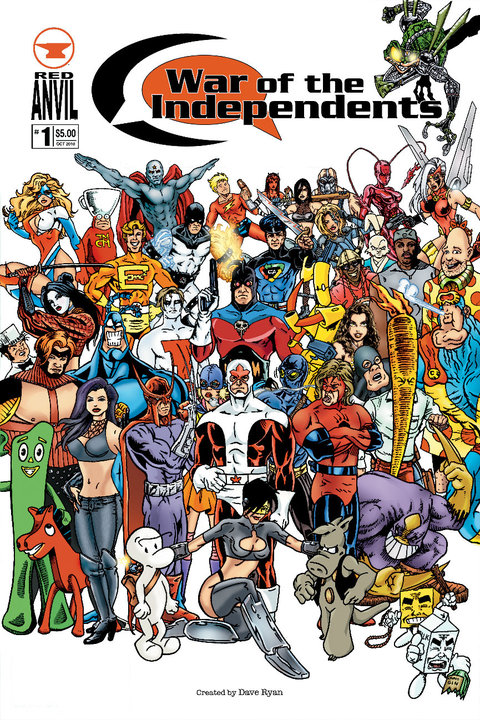 War of the Independents is a 6-issue crossover series by US creator Dave Ryan and published by Red Anvil Comics that features dozens of independent comic heroes from various publishers, and the first issue is debuting in October 2010 at the New York Comic-Con. Advance publicity has provided an eclectic list of characters who will be appearing, and the cover to #1 (pictured above) features Canadian comics characters such as Cerebus (created by Dave Sim), Mr. Monster (created by the late Fred Kelly), Reid Fleming – World’s Toughest Milkman (created by David Boswell) and Captain Canuck (created by Ron Leishman & Richard Comely).