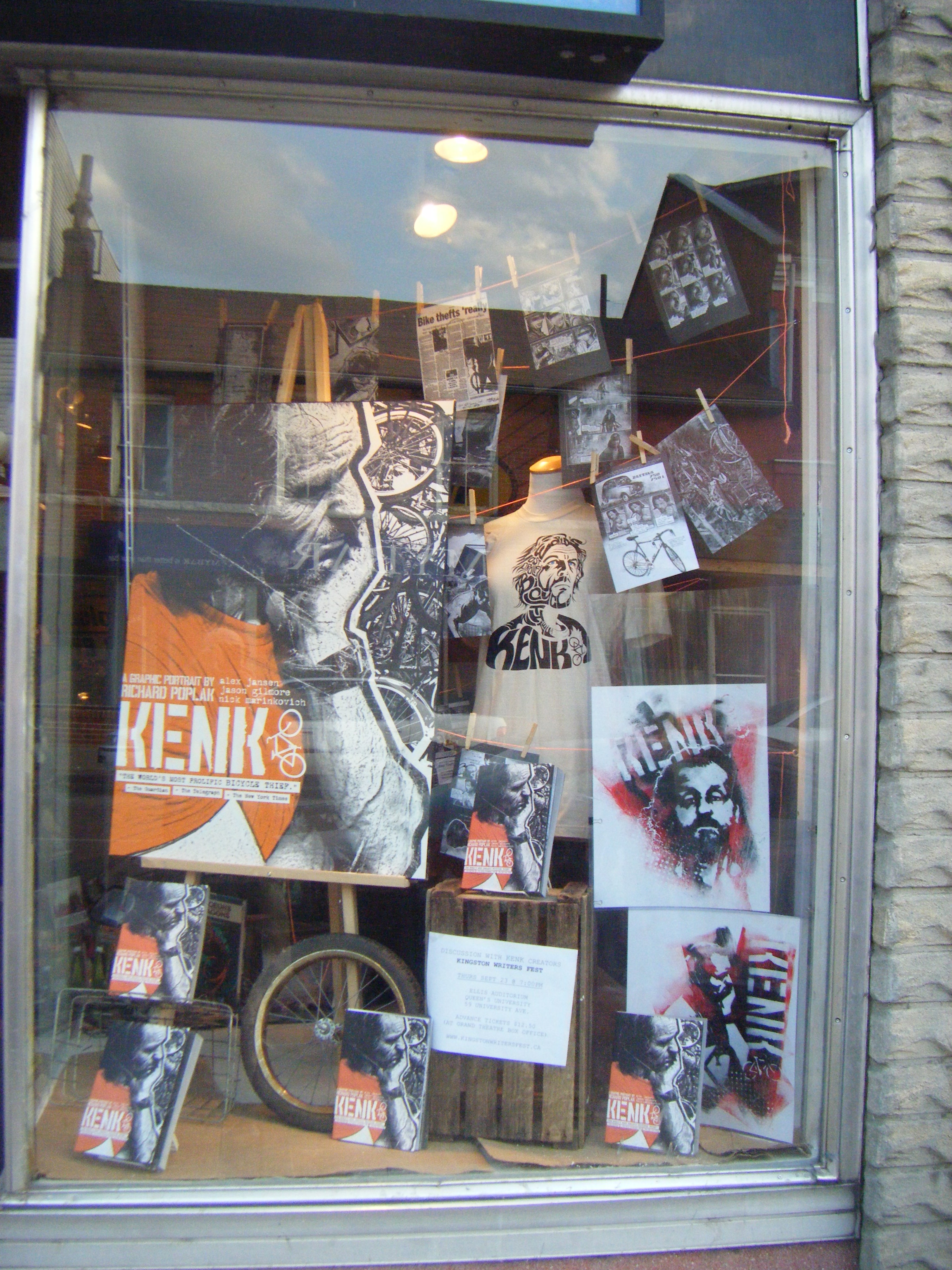 4-Colour, 8-Bit Comics & Games in Kingston, Ontario has used one half of their window space to advertise the Canadian graphic novel ‘Kenk‘ by Richard Poplak, Alex Jensen, Jason Gilmore and Nick Marinkovich. The critically acclaimed graphic novel is based on the life of Igor Kenk, the notorious Toronto-based bicycle thief.