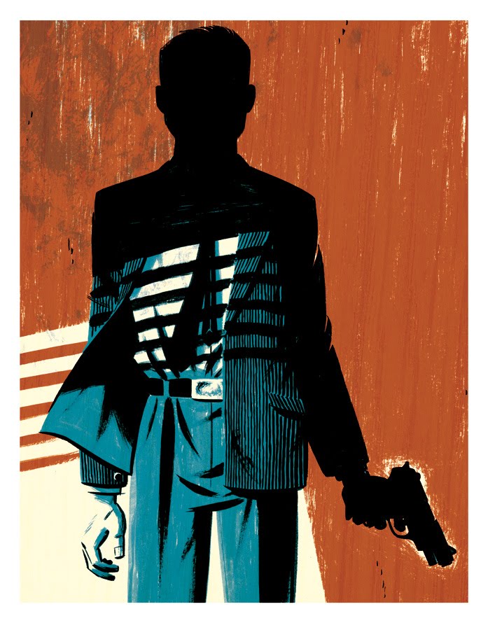 This was a recent cover that I painted for Quill and Quire magazine, for their January 2011 issue. The theme was on the rise in popularity of crime fiction. I worked out a bunch of different rough concepts, but in the end went with the idea of just putting a strong iconic image on the cover. The masthead is meant to cover the top of the image, obscuring the head of the figure. The final art was painted in gouache and ink, with some slight tweaking in photoshop.