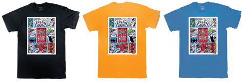 “I looked at last year’s shirt design by Sergio and there simply isn’t any way to top that in one image,” said Cooke. “This brought me to the idea of celebrating the form with the design, and putting all our info into a classic comic page layout. The rest became quite easy because the decision to go that way led me to doing VERY poppy, iconic images for the panels that had fun with the idea of the DC heroes in the store.”