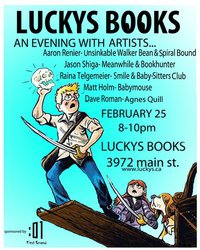 Lucky’s hosted a great event featuring Aaron Renier (Unsinkable Walter Bean), Jason Shiga (Meanwhile: Pick Any Path), Raina Telgemeier (Smile), Matt Holm (Babymouse) & Dave Roman (Jax Epoch and the Quicken Forbidden)