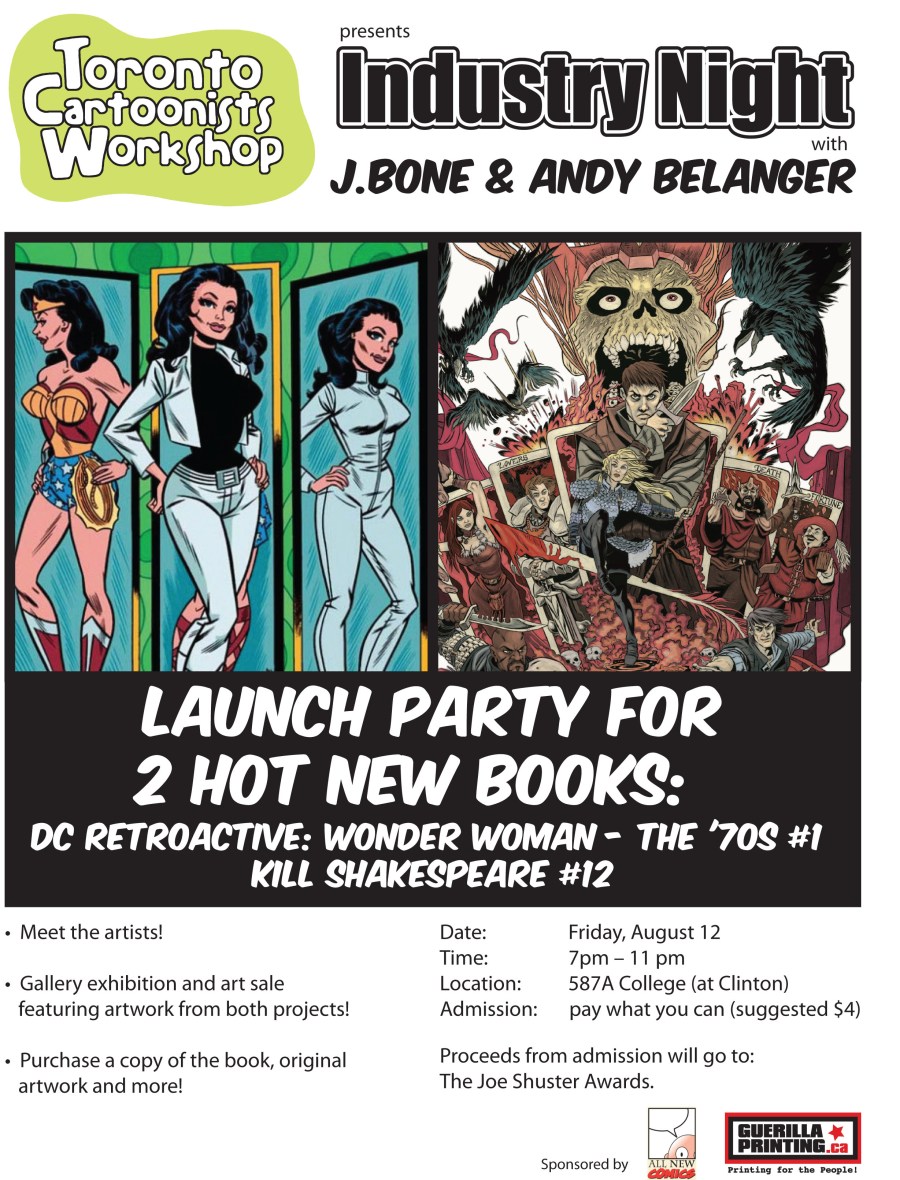 Join us as we celebrate the launch two recent releases by Toronto creator J. Bone (DC RETROACTIVE: WONDER WOMAN – THE ‘70s #1) and Andy Belanger (KILL SHAKESPEARE #12 – the last issue of the ground-breaking series!).