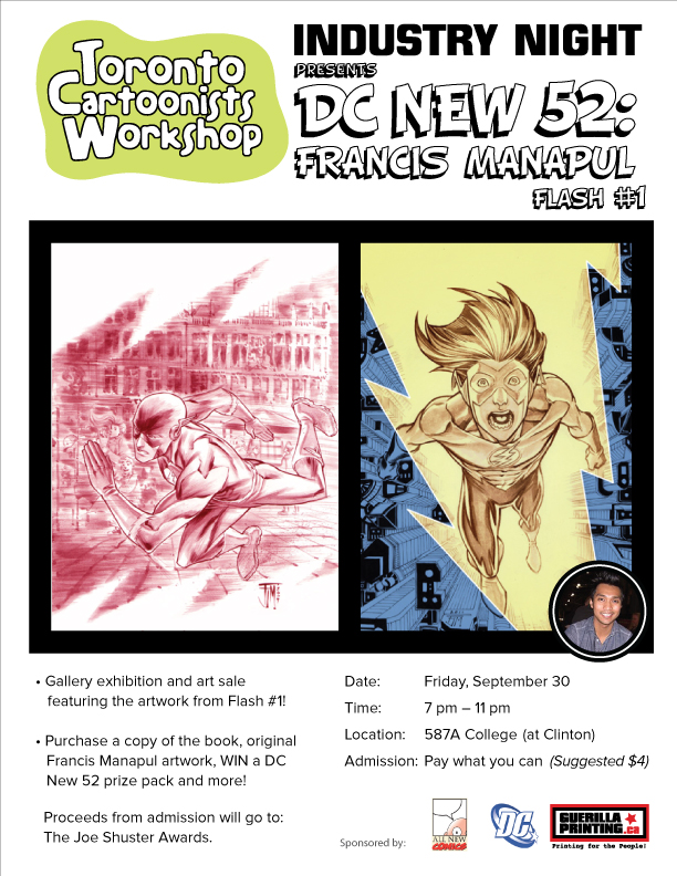 Toronto Cartoonists Workshop presents Industry Night with Francis Manapul – DC: The New 52: The Flash #1 Release Party & Gallery Show – Friday, SEPTEMBER 30th.