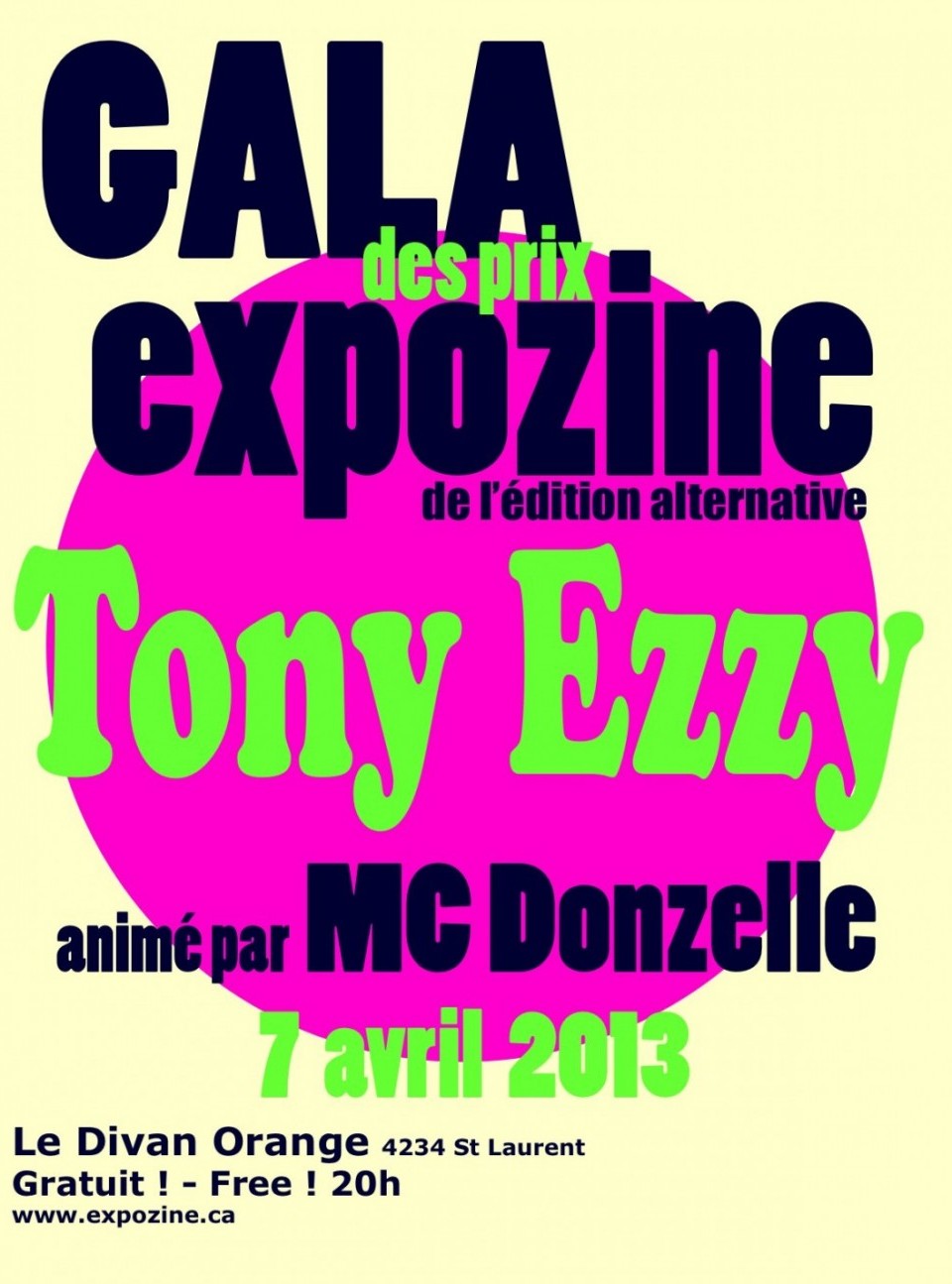 The Expozine Alternative Press Awards recognize the best publications that were on display at Expozine in the fall of 2012. The Awards Gala took place on Sunday, April 7, 2013 at Le Divan Orange. Montreal’s fantastic rappeuse Donzelle was the MC for the evening, which culminated in a performance by Montreal’s premier paramour of “Weird Funk”, Tony Ezzy! Click here for more info!