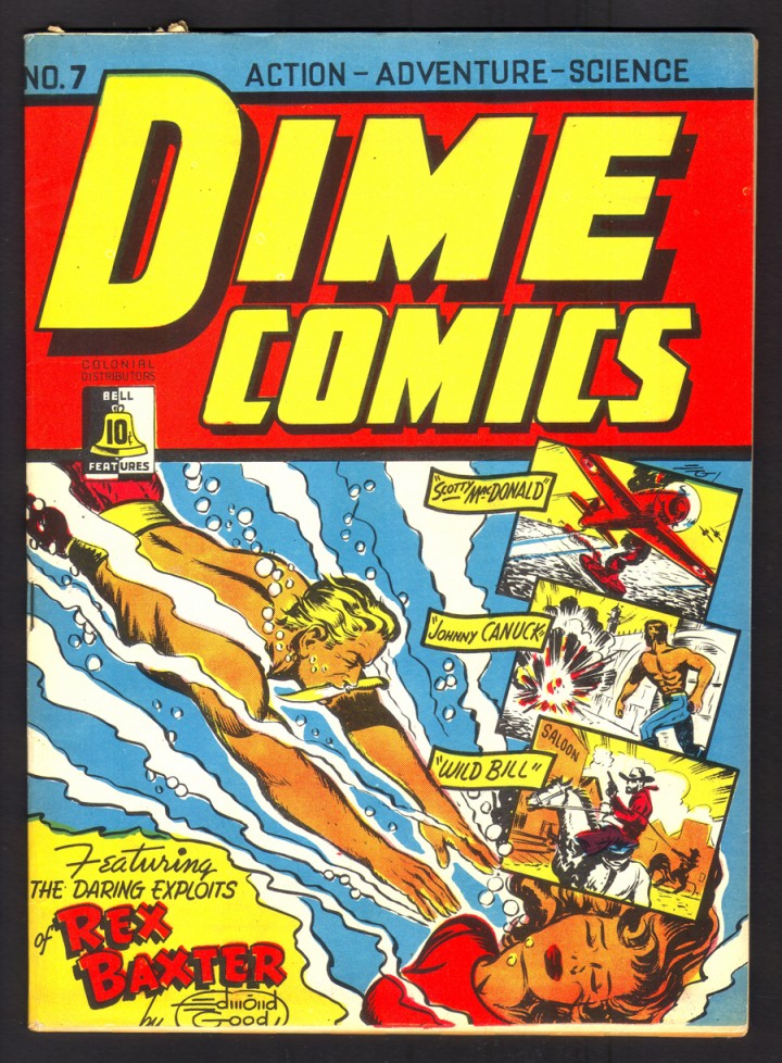 Edmond Elbridge Good was born on July 1 (ironically, now Canada Day then Dominion Day in Canada) 1910 in Saco, Maine to parents originally from the Maritimes. The family returned to Canada when Edmond was 10 and settled in Hamilton, Ontario. Edmond received his art training there and was hired as the first Art Director by Cy Bell for his comic publishing business. Good created his best known strip, Rex Baxter, as the lead feature for the new title Dime Comics in Feb. of 1942. He continued producing this feature and all the covers for Dime Comics until issue 13. After Adrian Dingle, Good did the greatest number of covers for Bell Features (Wow Comics 8-13, Commando Comics 1-6, and others. Good continued to work for Bell Features, even after Cy Bell hired Adrian Dingle as Art Director in the spring of 1942. Good also did a number of Canadian pulp covers during this period. He then left for