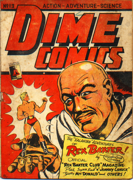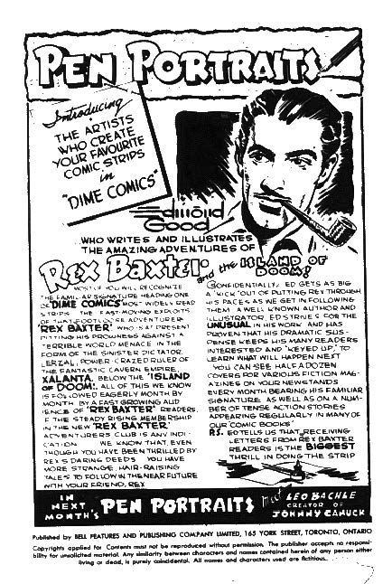 Good created his best known strip, Rex Baxter, as the lead feature for the new title Dime Comics in Feb. of 1942. He continued producing this feature and all the covers for Dime Comics until issue 13. After Adrian Dingle, Good did the greatest number of covers for Bell Features (Wow Comics 8-13, Commando Comics 1-6, and others.